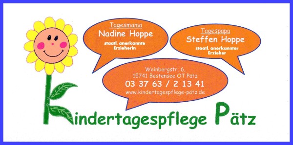 Kindertagespflege Bestensee / Pätz, Nadine und Steffen Hoppe, Weinbergstraße 6, 15741 Bestensee OT Pätz, Tel.: 03 37 63/ 2 13 41 |  |